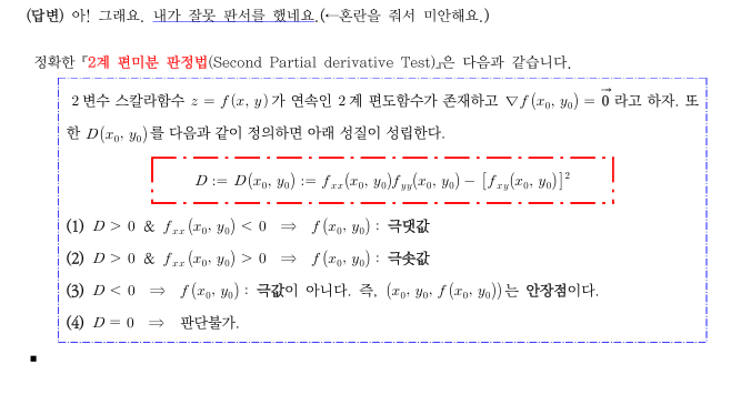 이계편미분 판정법 판서하실 때 D=0이 안장점이고 D<0이 판정불가라고 판서해주셨는데 책에는 D<0이 안장점이고 D=0이 판정불가라는데 어느게 맞는건가요?