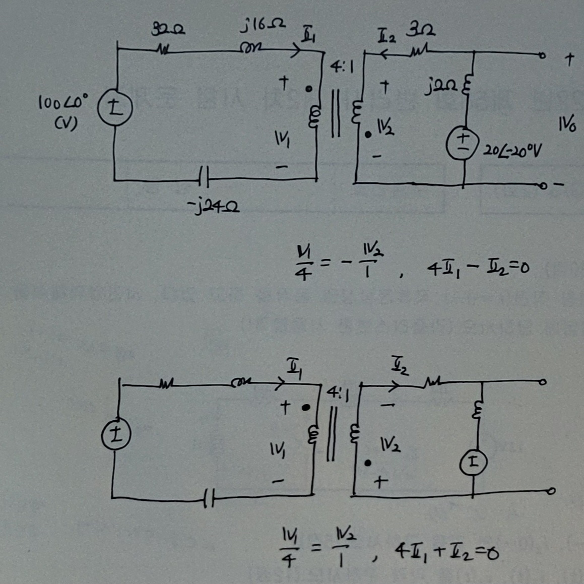 이상변압기가 포함된 회로는 해석이 복잡한데 각 인덕터에 걸리는 전압 2개, 전류 2개씩 해서 최소 4개의 미지수가 필요하기 때문입니다.