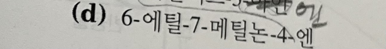 수업내용에의하면 메인사슬에서 이중결합 기준 양쪽 탄소수 동일하니까 작용기 있는쪽인 오른쪽부터 카운트하면 3뷰틸-옥트-4-엔 아닌가요?