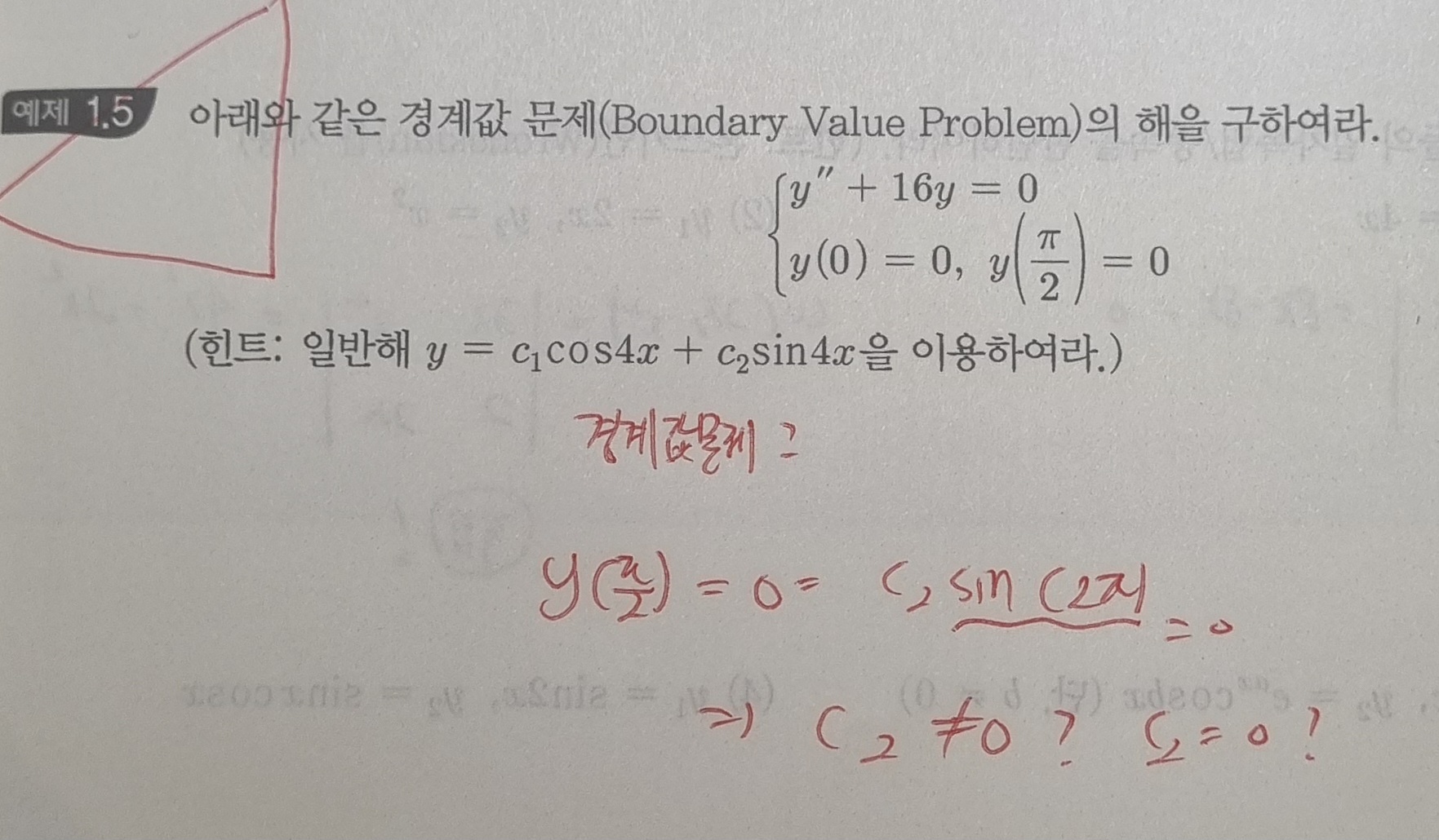 그런데 경계값을 주어진 해에 대입하면 c1=0이 나오고, c2=0일수도 있고 아닐수도 있습니다(sin(2ㅠ)가 0이기 때문).