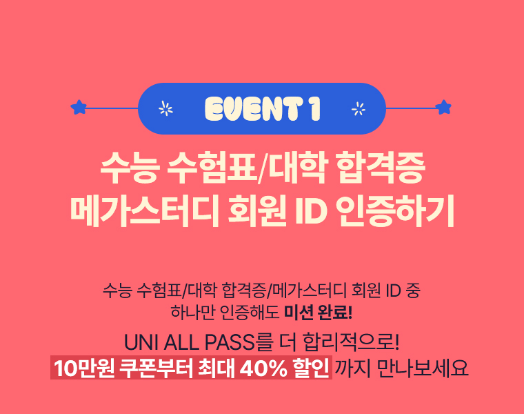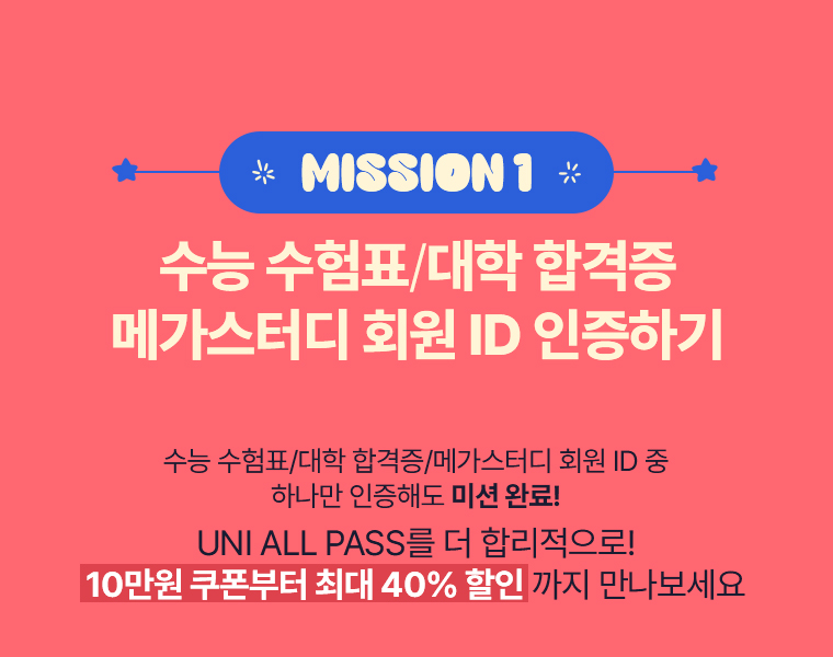 수능 수험표/대학 합격증/메가스터디 회원 ID 중 하나만 인증해도 미션 완료!