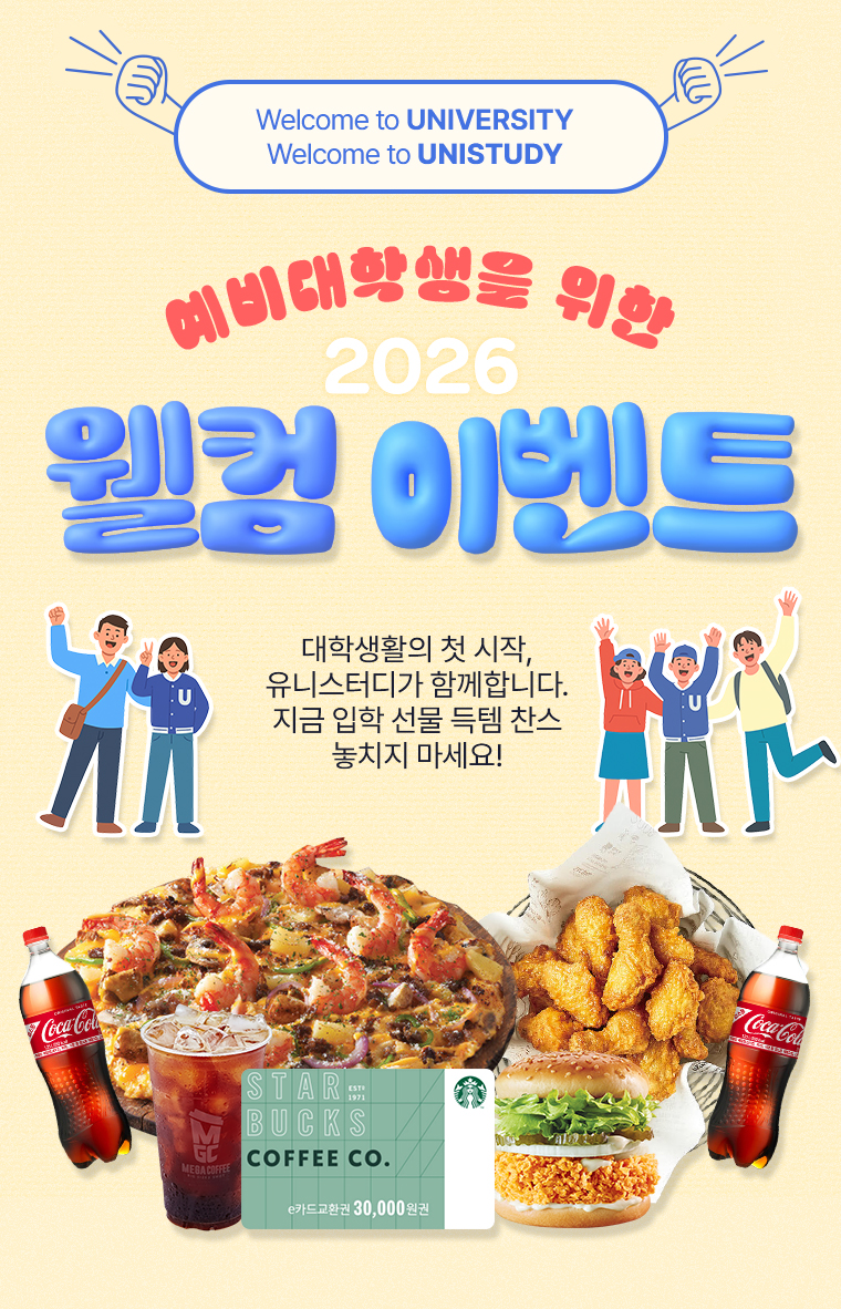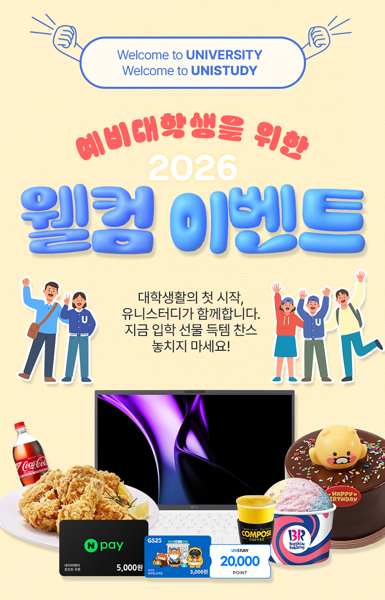 대학생활의 첫 시작, 유니스터디가 함께합니다. 지금 입학 선물 득템 찬스 놓치지 마세요!