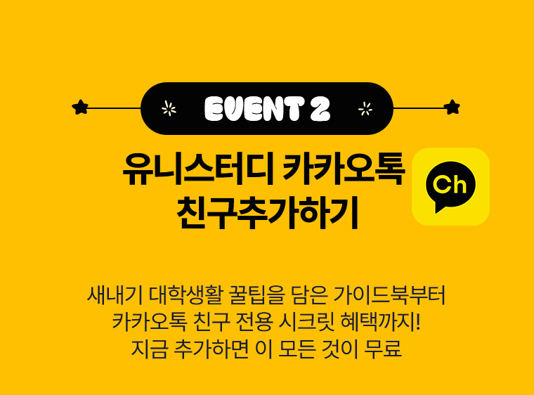 새내기 대학생활 꿀팁을 담은 가이드북부터 카카오톡 친구 전용 시크릿 혜택까지! 지금 추가하면 이 모든 것이 무료