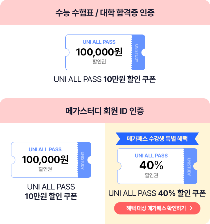 UNI ALL PASS를 더 합리적으로! 10만원 쿠폰부터 최대 40% 할인 까지 만나보세요