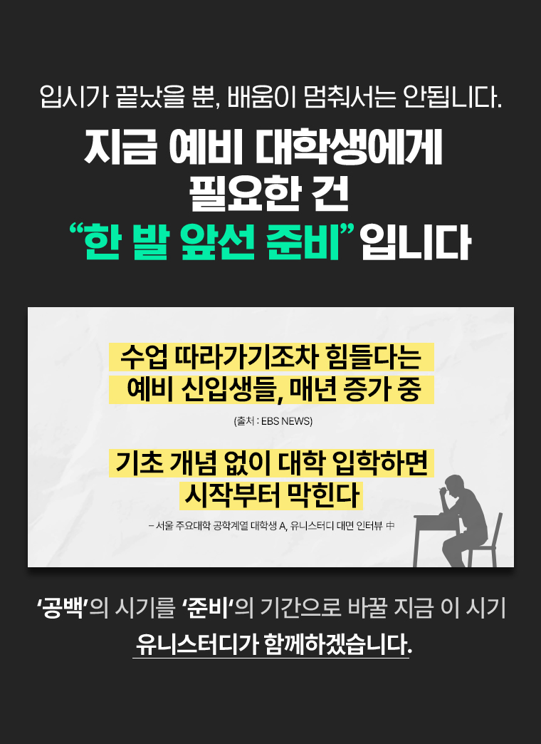 → 기초 개념 없이 대학 입학하면 시작부터 막힌다 – 서울 주요대학 공학계열 대학생 A, 유니스터디 대면 인터뷰 中‘공백’의 시기를 ‘준비‘의 기간으로 바꿀 지금 이 시기 유니스터디가 함께하겠습니다.