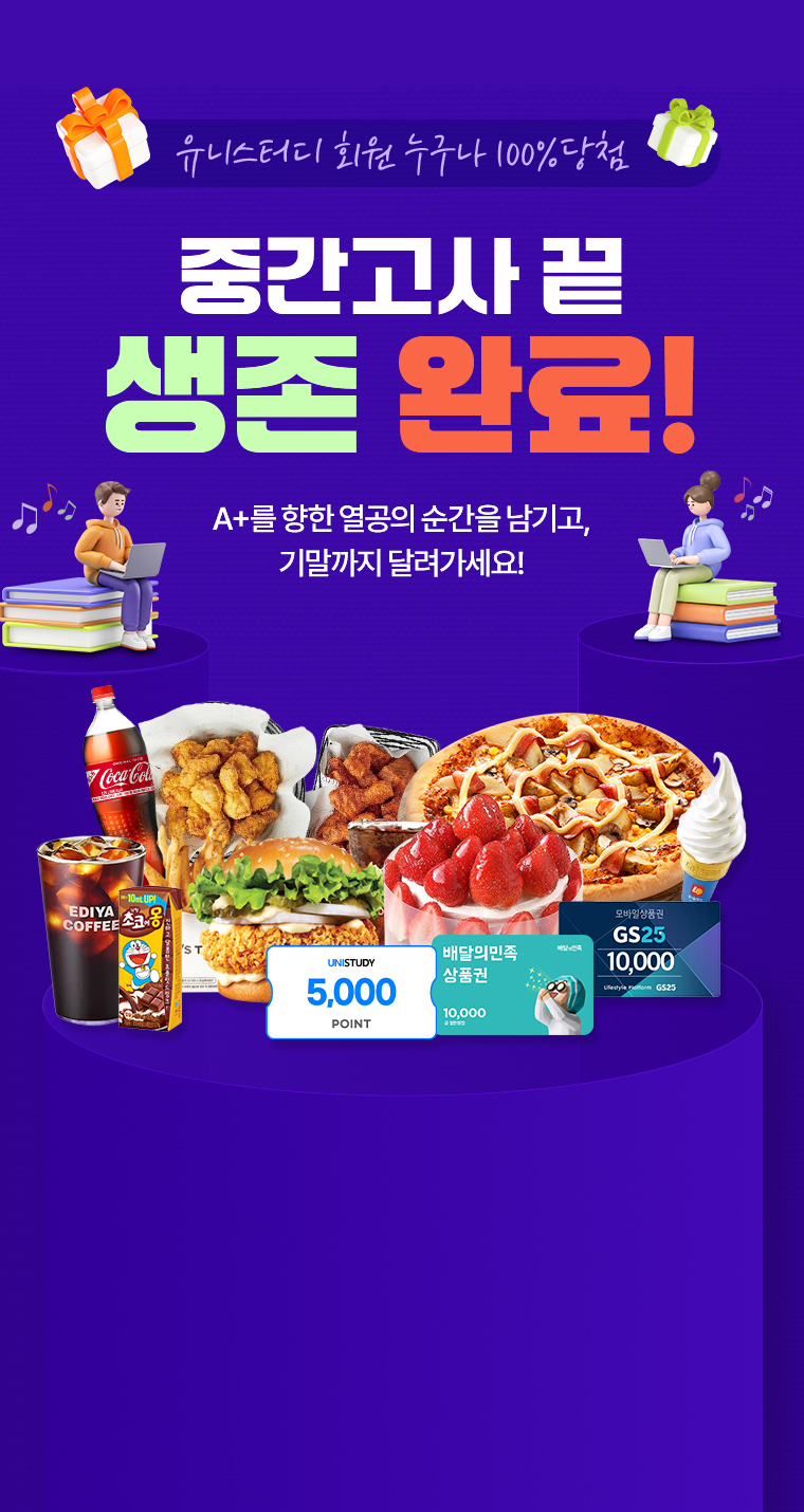 • 당첨자 발표는 5월 19일(화) 유니스터디 공지사항 게시판에 안내 예정이며, 상품이 일괄발송 될 예정입니다.
