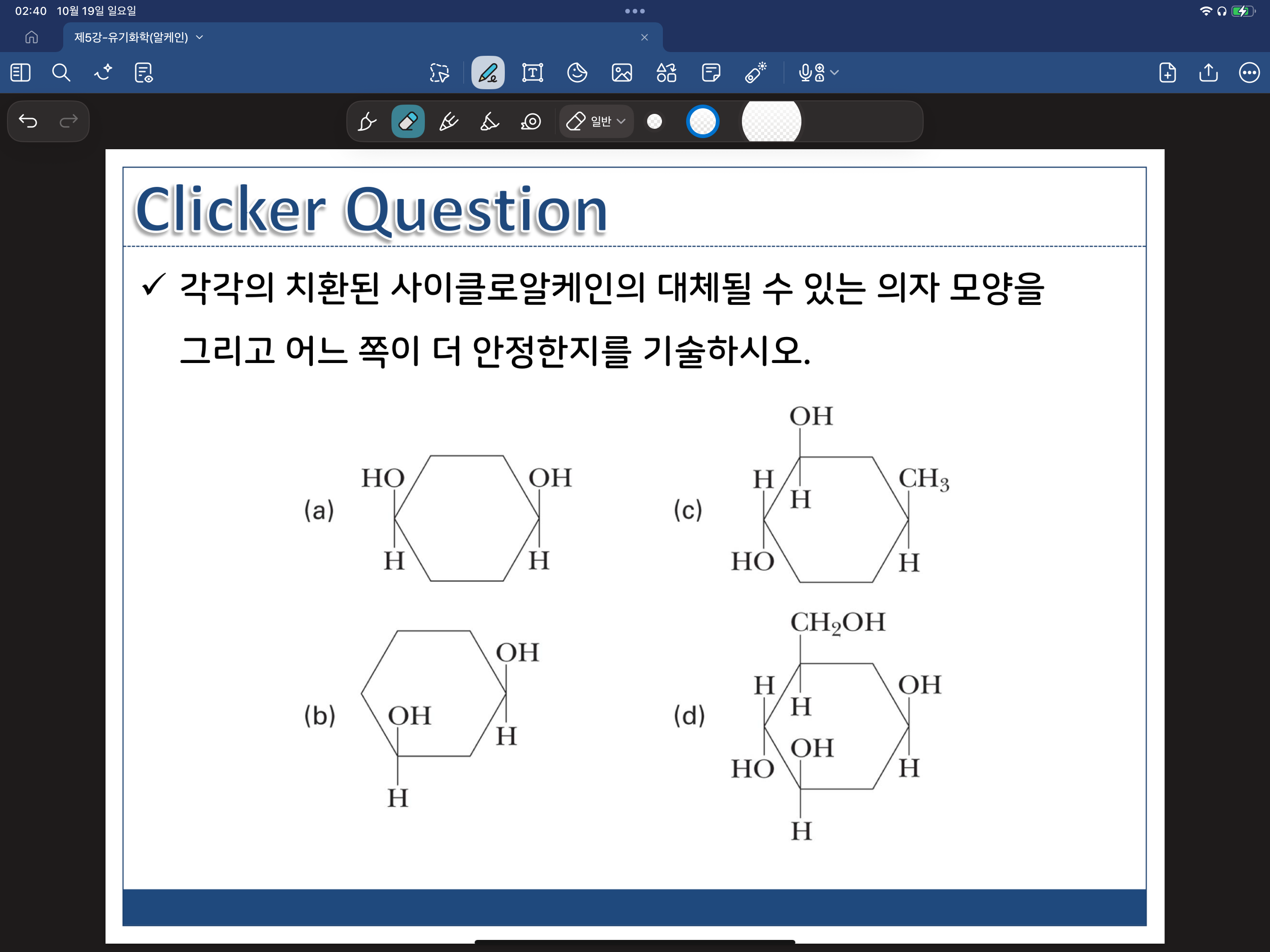 즉, a)의 경우 1,4-치환 cis 입니다. 이게 파악되었다면 1,4-치환 cis는 (a,e) 이고 flip 하면 (e,a)입니다.