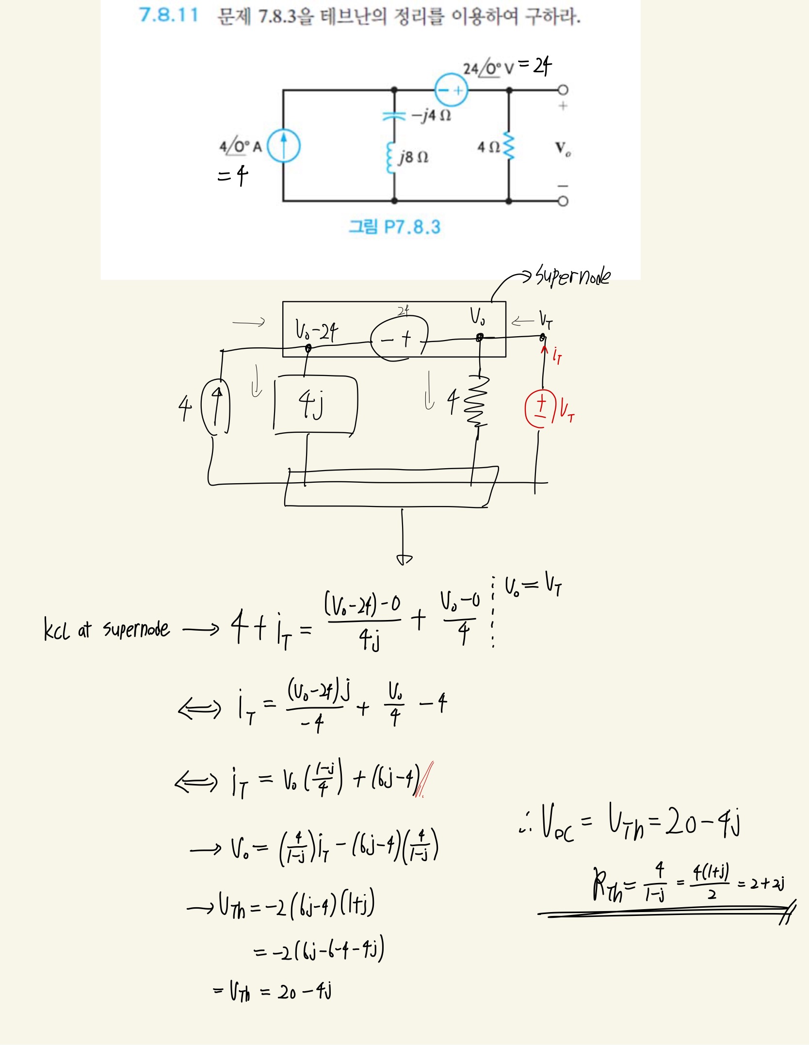 (HW1 Solution 파일 참조하면 이 문제의 테브난 등가회로에서 Rth=j4 ohm 이다.) (2번째 파일에 첨부함)