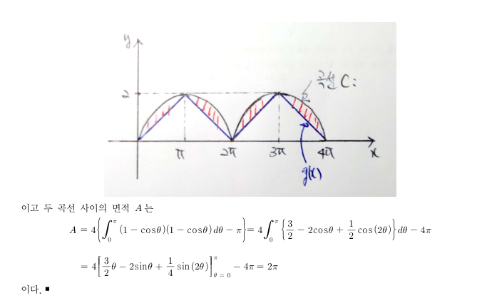 싸이클로이드 매개방정식과 f(t)를 하나의 그래프에 함께 그려보면 다음과 같은 그래프가 된다고 생각하여 그리게 되었습니다.