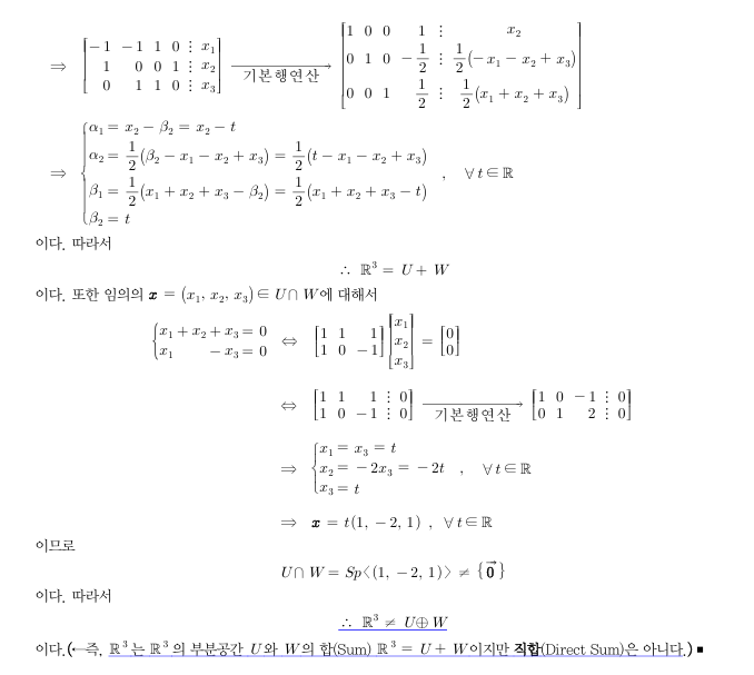 이 둘의 직합을 구하는데 기저가 4개니깐 r3공간을 초과합니다.