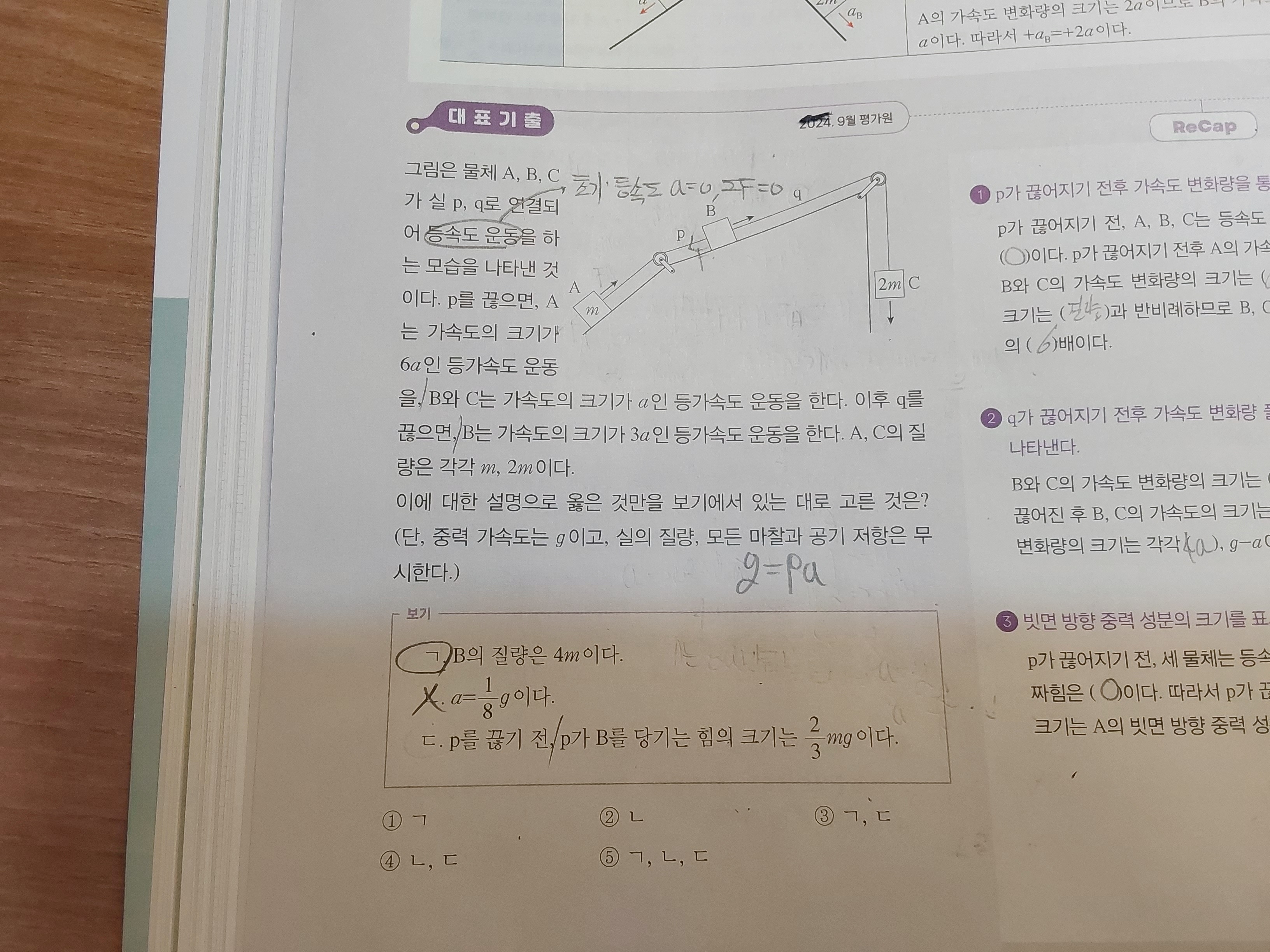 처음에 p에 연결되어 있을 때, 등속도 운동하므로 A의 빗면 방향 중력의 크기와 p가 당기는 힘의 크기가 같으므로